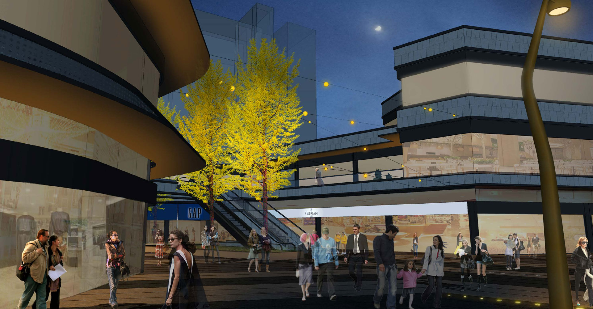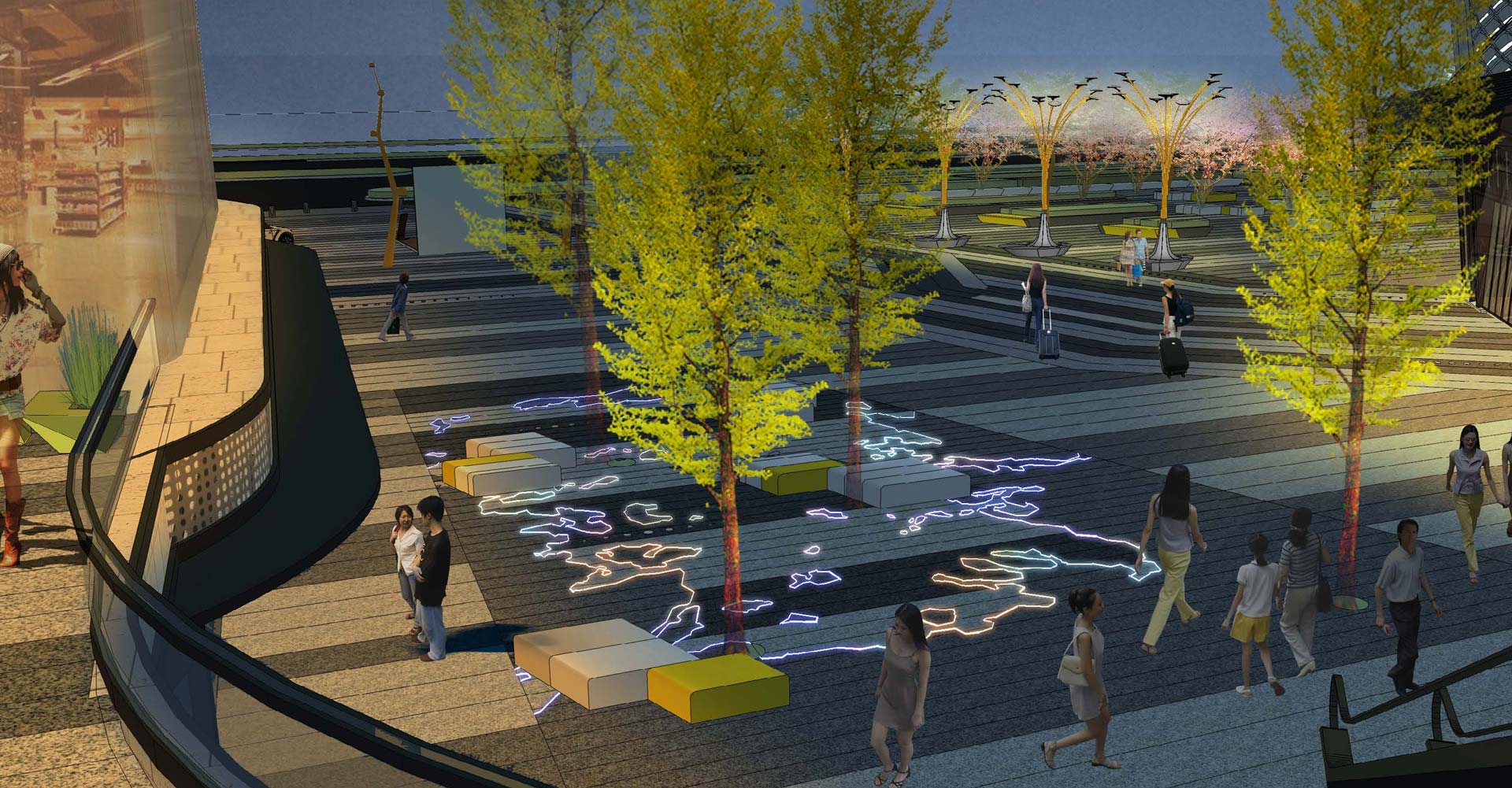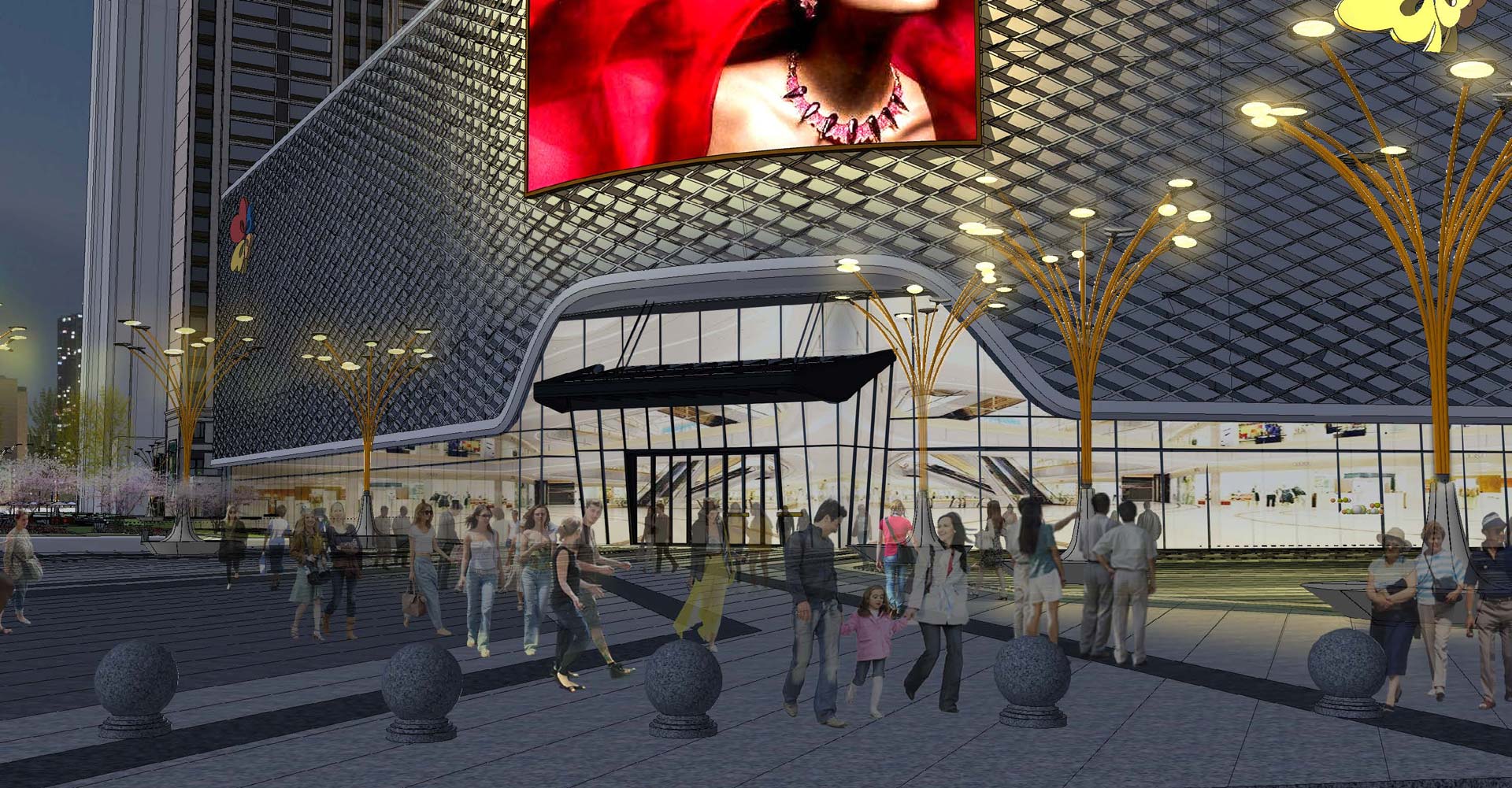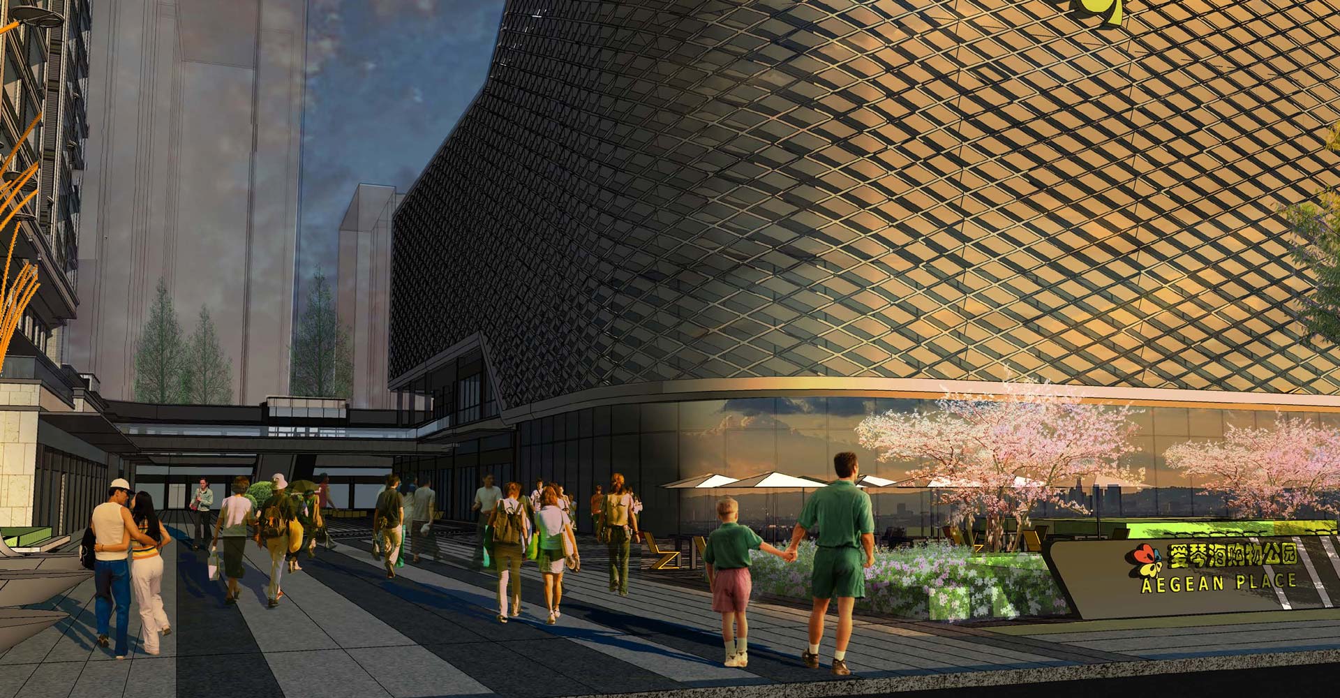 该项目在设计中通过提取海洋文化、海洋元素 ,打造网红IP,营造“欢乐海”概念活动氛围。运用波浪、鲸鱼元素勾勒整个场地,展现别样的现代式海洋景观。场地铺装采用波浪式分割布局,通过颜色层次的变化表现海洋波浪,构成大尺度空间。休憩、秀场、展览、游乐是整个商业场地的活动导向,活动空间包容性强,推动交流。特色景观灯具、家具,散布的海豚外形的花坛,点亮、激活整个场地。